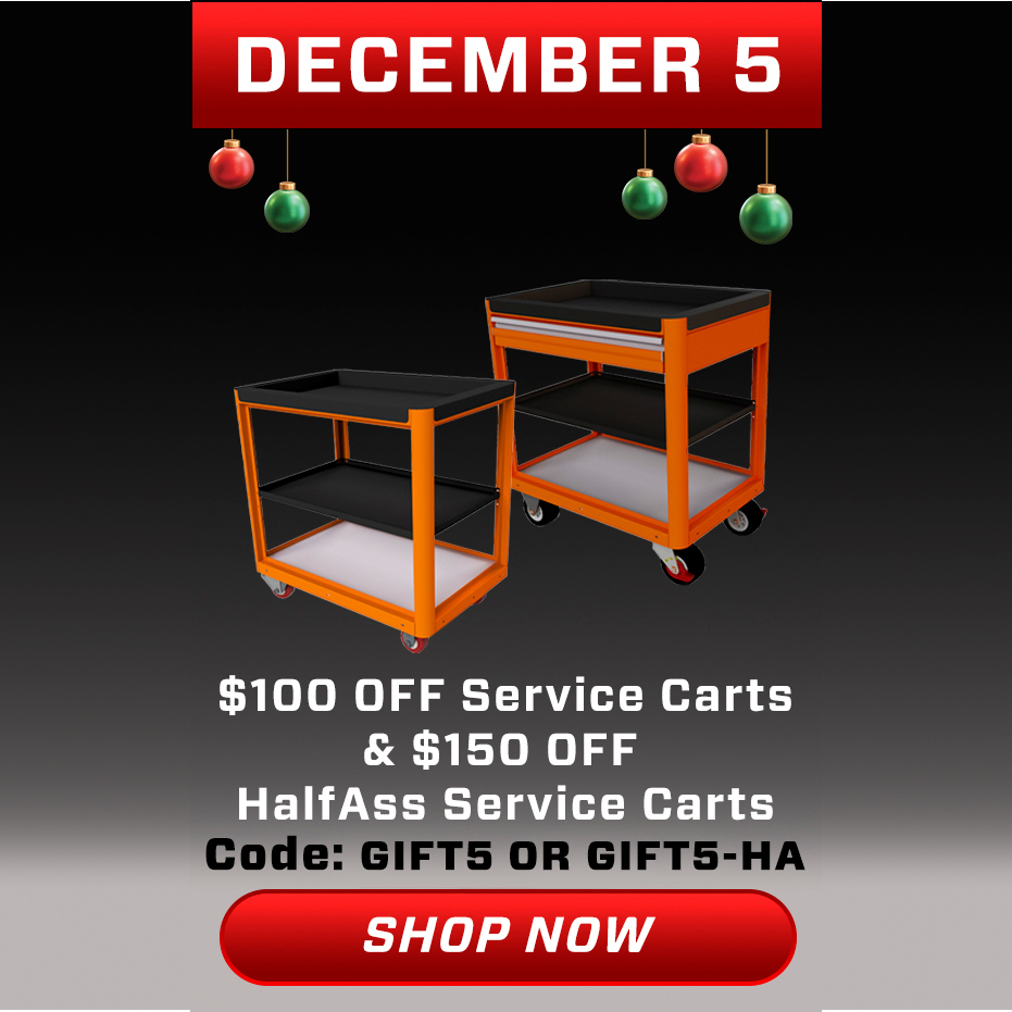 You've found today's exclusive deal! For one day only take advantage of $100 off any Service Cart or $150 off any HalfAss Service Cart. Offer valid December 5, 2025. Order totals calculated before tax and shipping. Customer must add products to their shopping cart and then enter the code GIFT5 (Standard) or GIFT5-HA (HalfAss) at check-out to receive the offer. Terms and conditions apply.